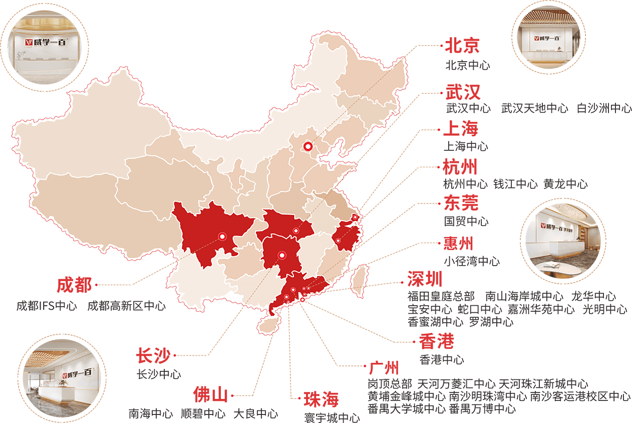 經過多年深耕與發展,目前威學一百在全國多個城市已經成立了40+中心!