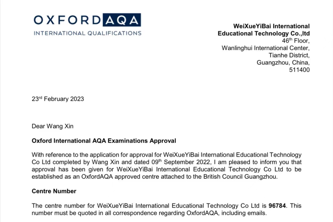 喜訊 | 威學(xué)一百獲牛津AQA考試局授權(quán)官方考點(diǎn)!代碼:96784
