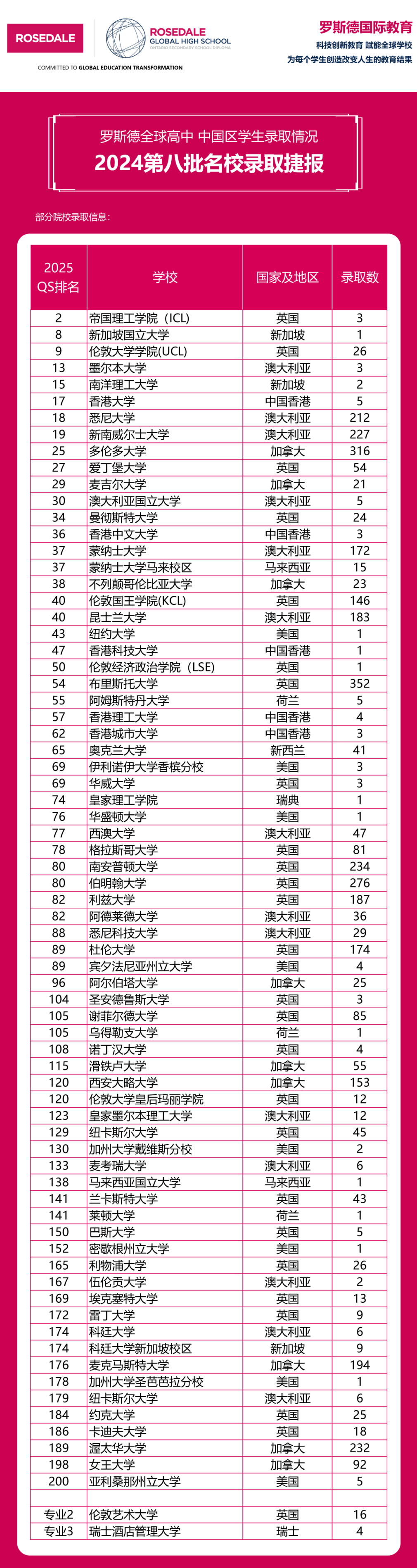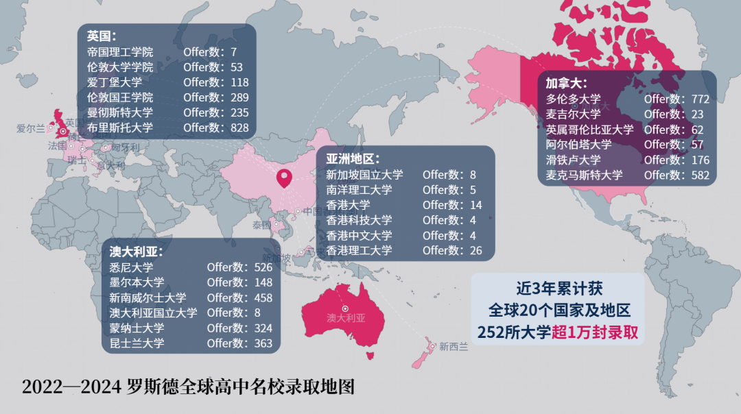 羅斯德全球高中OSSD課程為選擇國際路線的學生提供了無限可能,2022-2024近3年錄取,羅斯德畢業生已獲得全球20個國家及地區252所大學超1萬封錄取!