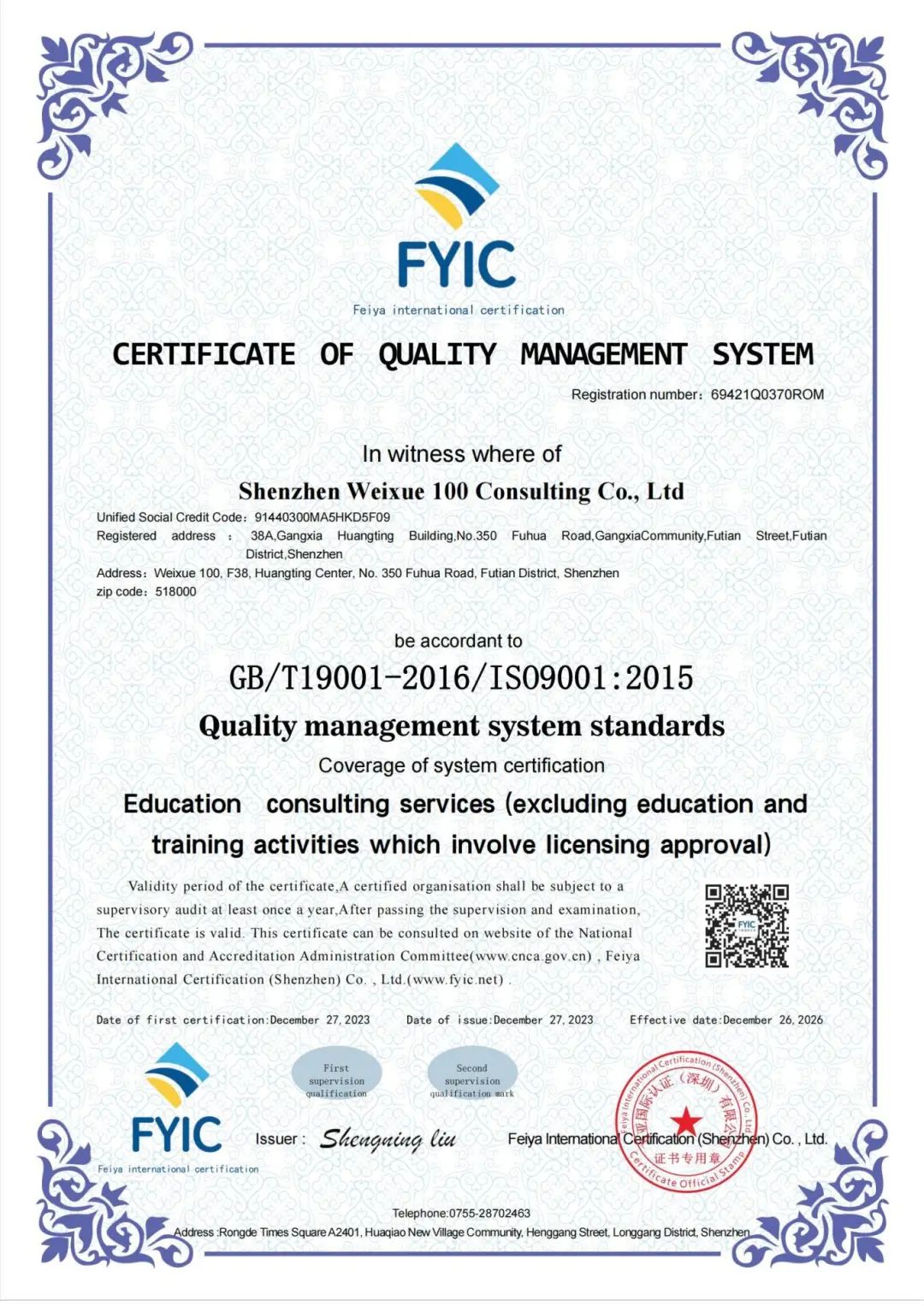 威學一百此次榮獲ISO 9001質量管理體系認證,不僅是對威學一百教育服務質量的權威肯定,更是對我們未來持續提升與創新的鞭策。威學一百將繼續秉持“全人教育”的理念,深化質量管理體系建設,不斷創新教育產品與服務模式,為學員提供更加優質、高效、個性化的國際教育咨詢方案,邁向新的質量高地。