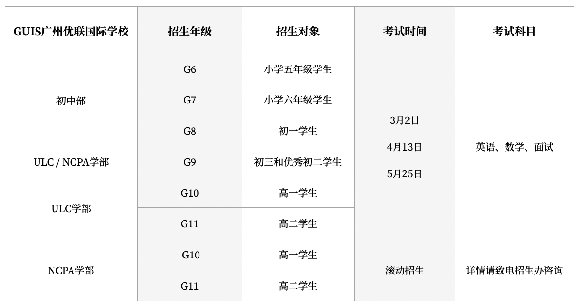 剛剛,廣州優(yōu)聯(lián)國際學校(ULC&NCPA)正式公布了2025-2026學年的入學考試大綱!此次考綱調(diào)整主要針對ULC&NCPA學部G9年級和ULC學部G10/11年級。