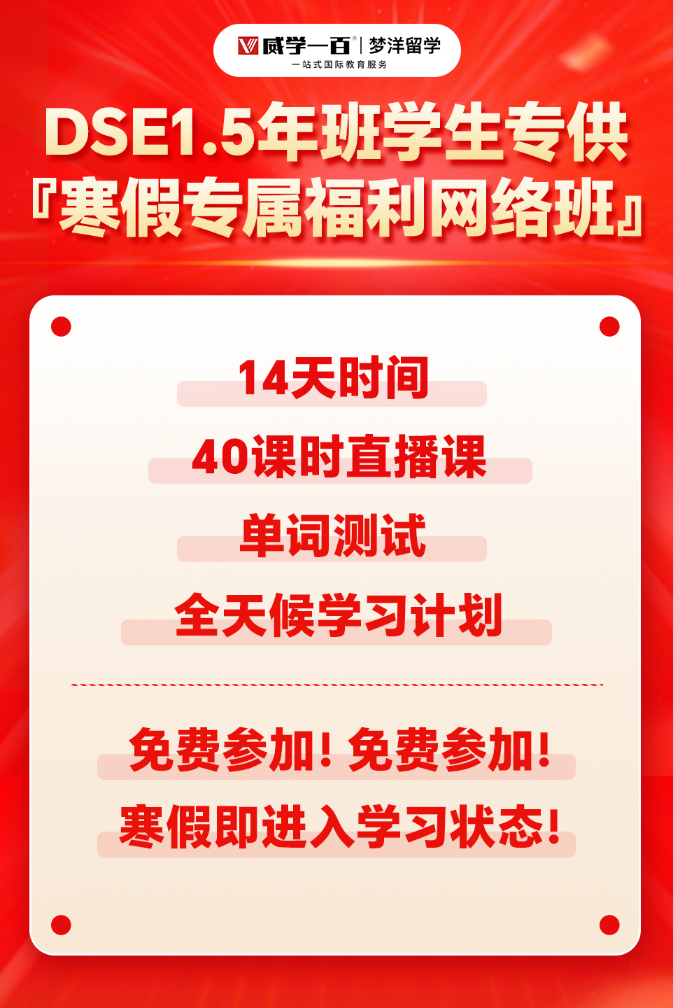 對于已經報名了威學DSE1.5年班的同學來說,提前做好學習鋪墊至關重要。即將到來的寒假正是搶占先機的黃金時期,合理利用這段時間熟悉備考方向、培養良好學習習慣,能為3月正式開課打下堅實基礎!