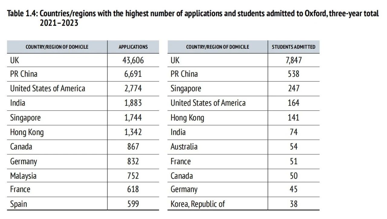 2021-2023年,中國大陸總計申請牛津大學的學生達6,691人,其中有538人被成功錄取,錄取率為8.04%,比上一統計周期的7.6%上漲了約0.44%。中國香港地區共有1,342人申請,其中141人被錄取,錄取率為10.51%。
