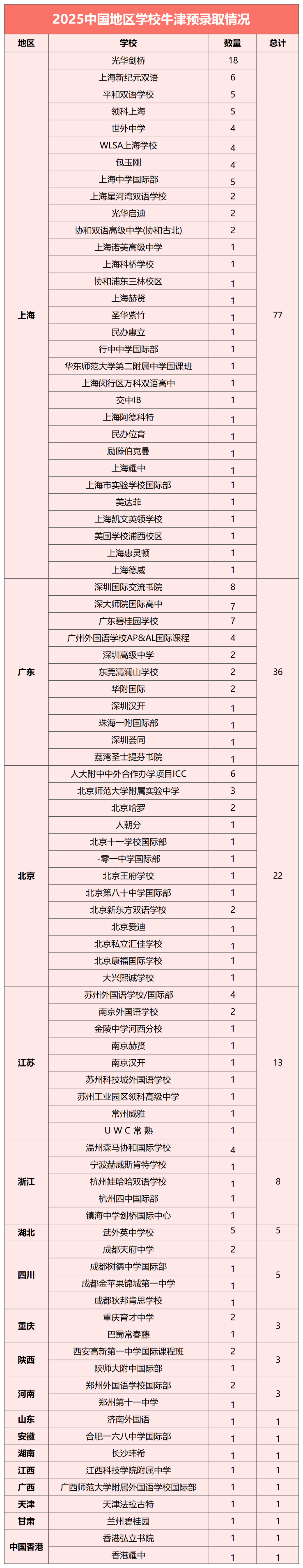 北上廣深作為一線城市遙遙領先!上海以77枚的總數,暫時領先。其中,上海光華劍橋以18枚的驚人錄取數傲居全國第一!