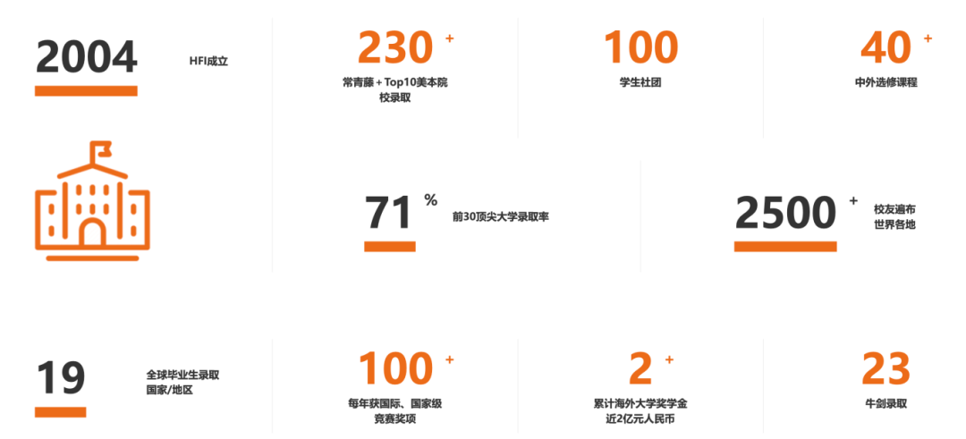 應屆生和插班生入學考試均在上述場次進行; HFI每年設置兩場入學考試機會,考生自愿選擇考試時間,只能參加其中一場,不可重復考試; 入學考試面試時間一般為筆試后一周的周末進行,具體安排以HFI通知為準; 數學試卷:初三(9年級)應屆生考生使用中文卷,插班生考試使用全英文考卷; 報名須知 01 報名方式 填寫報名表 02 提交準考證資料 可直接在報名表填寫時提交; 報名表中未提交,請聯系招辦老師補齊準考證資料; 03 準考證辦理資料(電子版) 有效身份證件電子圖片(身份證/護照等); 學生證(學生卡)或在讀證明文件電子圖片; 六個月內免冠正面彩色底大一寸照片電子版; 考務費500元(不可退); 最近3個學期的獲獎證書/證明等(如有); 04 準考證打印 經校方確認資料無誤后,學生將收到準考證號; 考前一周將開放電子準考證下載,學生需自行下載打印,憑紙質版準考證參加考試; 關于HFI華附國際部 華南師范大學附屬中學國際部,成立于2004年,系由廣東省教育廳批準成立的華師附中國際基礎課程中心,于2009年初正式更名為華南師范大學附屬中學國際部(華附國際部),以下簡稱為HFI。 FI的國際課程始于2004年由華南師范大學附屬中學與英國北方大學聯合會聯合開設的一年制IFY英澳預科(2004-2019)。2009年3月,在成功開設IFY英澳預科五年后,經美國大學理事會(College Board)授權批準,HFI開辦了華南地區首個AP美式高中。AP學校代碼:694293。 經過多年有序的辦學實踐,HFI已培養出超過2500名畢業生(含IFY英澳預科項目),畢業生遍布全球19個國家和地區。HFI一直保持著高標準的辦學目標,歷屆畢業生: 100%被世界名校錄取 93%被美國前50的綜合性大學錄取 71%的同學被美國前30綜合性大學、文理學院、藝術設計學院、英國、加拿大及香港等國家和地區的名牌大學錄取 20%的同學被美國前20綜合性大學錄取 超過230人次獲得美國藤校+TOP10院校(本科級別)錄取 23人次獲得英國“牛劍”錄取 ▲ 歷屆AP學生英美頂尖院校錄取情況 卓越的融合課程 從最開始的課程引進到如今的“HFI原創”高中國際課程,HFI華附國際部始終在融合課程上不斷探索與實踐。 三年制課程 HFI三年制高中國際課程系國內高中課程與AP課程的多年有機融合實踐,形成了獨特且高難度的卓越融合課程體系,幫助學生搭建完整的知識架構,奠定扎實的學術基礎,養成嚴謹的學術作風,培養批判性和創造性思維,點燃學生追尋真理的激情。 四年制課程 HFI四年制強基課程體系是HFI在三年制融合課程體系的基礎上,有意識在科研素養和創新意識培養方面新開設的,獨立的課程體系。 強基課程從培養學生的學科興趣和熱愛著手,致力于開設更多符合學生學科興趣發展、拓展學生認知、完善學生知識架構的選修課程,建立更科學和人性化的課程體系,讓學生有機會去接觸和選修符合自己興趣愛好以及和自己能力相匹配的課程,是實現基于學生的基礎和興趣的個性化的教學體系。 目前,HFI與多所國家重點實驗室,包括數學,物理,化學,生物等學科方向簽訂合作協議,讓學生的興趣和熱愛從課堂延伸到課外。 HFI希望學生能夠持續抱有尋找問題、思考問題、解答問題的興趣,不斷地去探索和發掘更多的領域,在充分發揮學生主觀能動性的基礎上,讓學生在參與討論、調查、實驗以及實踐的過程中,培養對科研的熱愛,也讓他們的創新意識得到有效的鼓勵和鍛煉。 豐富的校園活動 HFI華附國際部有著豐富的校園活動,有些是由校方組織,如國際日、慈善系列活動、校運會等;而有些則是由學生自行安排,如VOICE好聲音;還有的,則是由學校、學生、家長三方共同參與,如一年一度的家校聯誼晚會等; 這些活動不僅是在課堂之外,豐富同學們的課余生活,更是希望能夠激發學生的創造力,鍛煉組織協調能力和交往溝通能力,在學術能力之外,擴展同學們的能力邊界。 國際日慈善嘉年華 國際日慈善系列活動 校運會 社團開放日 HFI好聲音歌唱比賽 校內運動比賽 Fine Arts Week 藝術周 特色課程活動 戈壁徒步活動 新生徒步活動