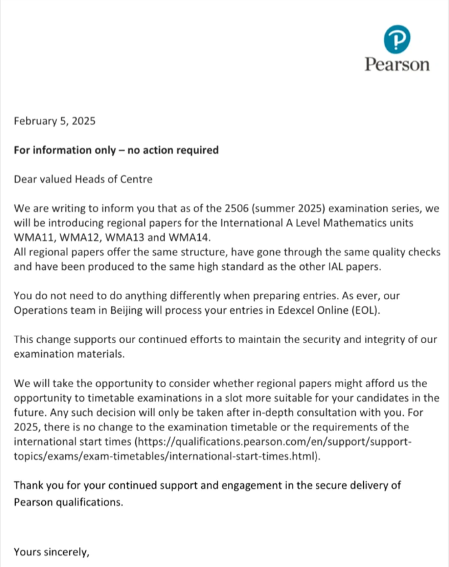 這封信主要表示:自2025年夏季(2506考試系列)起,國際A-Level數學單元WMA11、WMA12、WMA13和WMA14的考試將引入區域試卷。