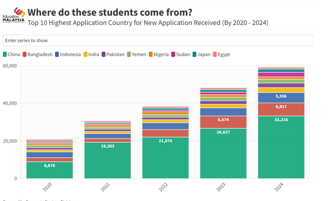 日前,馬來西亞教育全球服務中心(EMGS)發布了2024年留學申請數據,共有81,992名國際新生來馬來西亞留學,相比2023年的65,208人,增幅為25.74%。 另外,2024年留學馬來西亞的中國新生有33,216人,相比2023年的26,627人,增加了24.7%。在眾多生源國中,中國學生的申請熱情格外高漲,申請數量達到了 33,216 份,占總申請量的 41.97%,穩居第一。