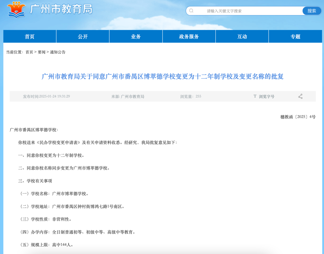 1月24日,廣州市教育局發布了關于同意廣州市番禺區博萃德學校變更為十二年制學校及變更名稱的批復。