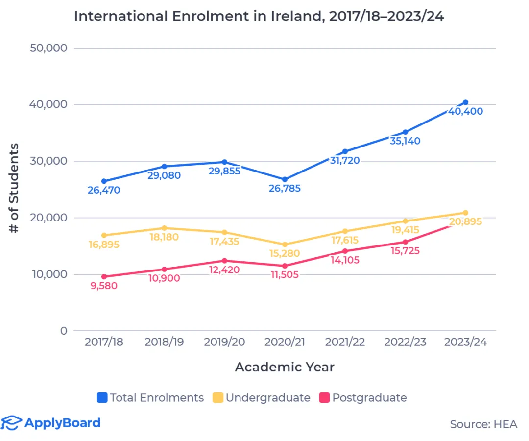 據知名申請平臺ApplyBoard發布的一份最新數據報告顯示:在2023/24年度,愛爾蘭高校的國際學生入學人數獲得創紀錄的增長,總量首次突破4萬人大關,增長率近15%。其中,本科生入學人數同比增長8%,研究生入學人數同比增長近25%。